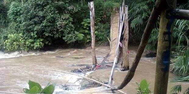 Tim SAR Bogor masih mencari korban jembatan Cihideung, Kecamatan Ciampea Bogor Jawa Barat, yang ambruk, Minggu (19/2/2012). Kala peristiwa terjadi, jembatan hanyut bersama 9 orang yang ada di atasnya.