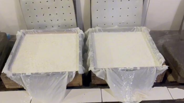 Setelah ampas dan sarinya dipisahkan, cuka diberikan. Cuka ini juga berasal dari air kedelai yang sebelumnya. Tujuannya agar terbentuk asam sehingga tahu memisah dari air. Gumpalan inilah yang kemudian dicetak dan dipres sekitar 10 sampai 15 menit agar menjadi tahu yang mengkel (padat).
